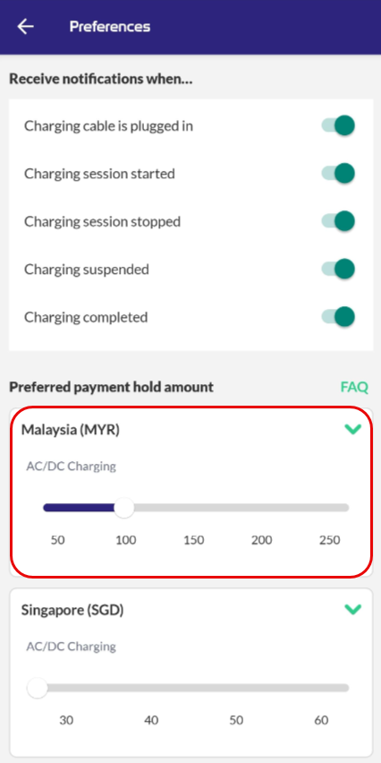 When you plug in your electric vehicle and initiates a charging session, the charging station communicates with the payment provider to place a default temporary hold on a specified amount of RM100.00 in Malaysia and SGD 50.00 in Singapore on your registered payment method.