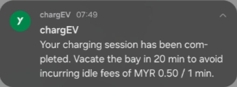 A notification is pushed to your app before the Idle Fees start. The alert is also shown on the 'Charging in Progress' page on the app.